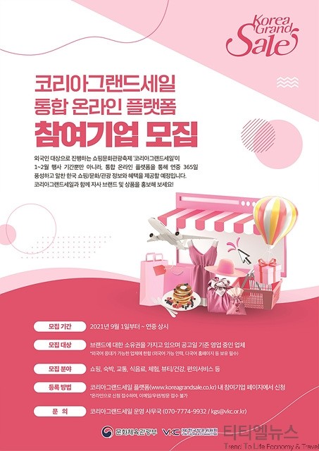 (재)한국방문위원회는 한국의 쇼핑문화관광 콘텐츠와 혜택을 제공하는 ‘코리아그랜드세일 통합 온라인 플랫폼’에 입점할 참여기업을 모집한다고 15일 밝혔다.