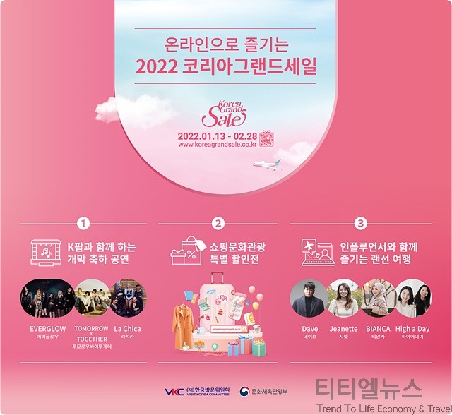 [티티엘뉴스] 문화체육관광부(장관 황희, 이하 문관부)는 (재)한국방문위원회와 함께 1월 13일부터 2월 28일까지 외국인을 대상으로 ‘2022 코리아그랜드세일(Korea Grand Sale)’을 개최한다고 12일 밝혔다.