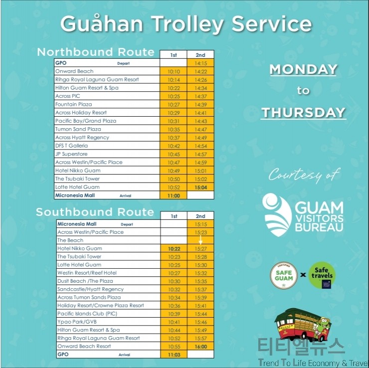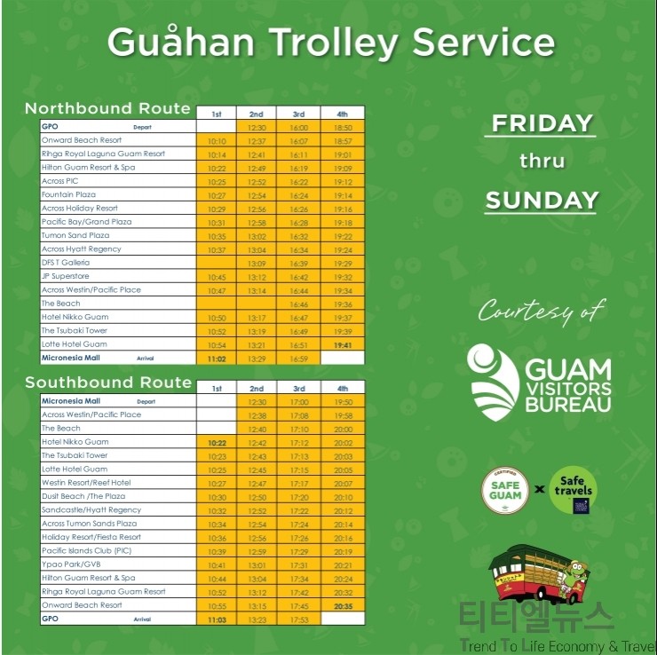 한편, 괌은 급증하고 있는 여행 수요에 맞추어 현지 관광기반시설 운영을 재개한다. 괌의 주요 관광지를 순환하는 트롤리 버스는 5월 1일부터 운영을 재개하며 본격적인 관광객 맞이에 나선다. 괌 현지 람람투어와의 제휴를 통해 트롤리 버스는 괌 프리미어 아울렛 (GPO)과 마이크로네시아몰 사이를 매일 오가며 관광객들에게 보다 편리한 교통수단을 제공할 예정이다.