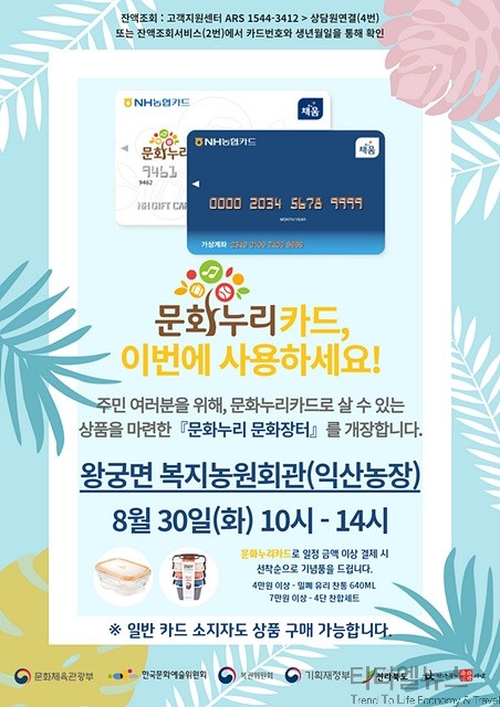 [티티엘뉴스] 전라북도문화관광재단(이하 재단)은 문화누리카드 이용자의 편의성 증진을 위해 통합문화이용권 지원사업 중 하나인 문화누리 문화장터가 8월 30일(화) 오전 10시부터 오후 2시까지 익산 왕궁면 복지농원회관에서 열린다고 26일 밝혔다.
