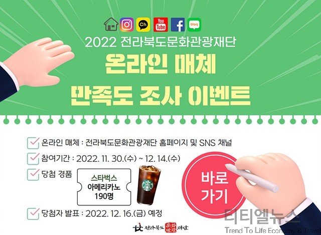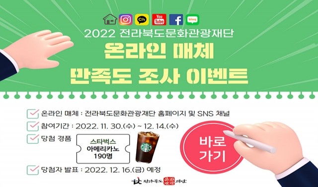[티티엘뉴스] 전라북도문화관광재단(대표이사 이경윤, 이하 재단)은 온라인매체(홈페이지 및 SNS) 만족도 조사를 실시한다고 2일 밝혔다.