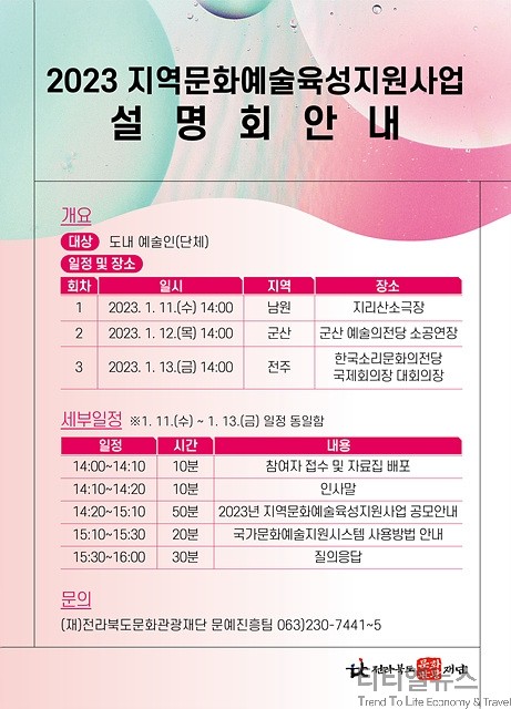 [티티엘뉴스] 전라북도문화관광재단(대표이사 이경윤, 이하 재단)은 지난해 12월 29일부터 올해 1월 25일까지 28일간 지역문화예술육성지원사업(구 문화예술진흥기금) 공모를 진행 중이라고 5일 밝혔다. 접수기간은 1월 9일부터 1월 25일까지 17일간이다.