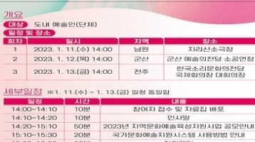 공모 관련 사업설명회는 ▷1월 11일(수) 오후 2시, 남원 지리산 소극장 ▷1월 12일(목) 오후 2시, 군산 예술의전당 소공연장 ▷1월 13일(금) 오후 2시, 한국소리문화의전당 국제회의장 대회의장에서 열린다.