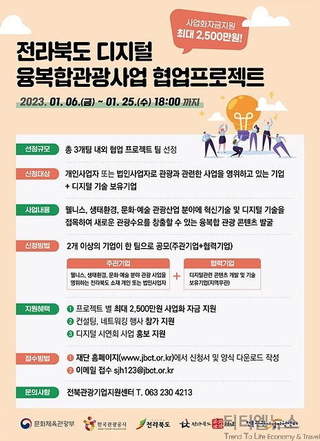 [티티엘뉴스] 전라북도와 전라북도문화관광재단(대표이사 이경윤. 이하 재단) 전북관광기업지원센터는 ‘전라북도 디지털 융복합관광사업 협업프로젝트’에 참여할 기업을 1월 6일부터 25일까지 모집한다고 12일 밝혔다.