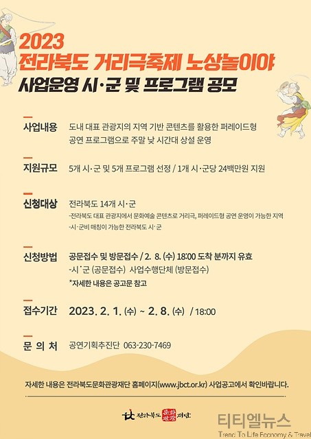 [티티엘뉴스] 전라북도문화관광재단(대표이사 이경윤, 이하 재단)이 전라북도 14개 시군을 대상으로 2023 전라북도 거리극축제 ‘노상놀이야’ 공모를 진행한다고 19일 밝혔다.