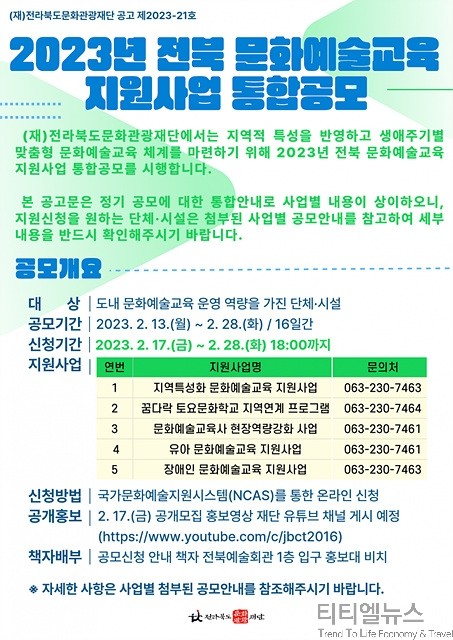 [티티엘뉴스] 전라북도문화관광재단(대표이사 이경윤, 이하 재단)이 오는 28일까지 2023년 전북 문화예술교육 지원사업 공모를 진행한다고 14일 밝혔다.
