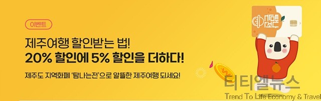 ▶혜택1, 제주여행 20% 즉시할인 20만원 이상 구매 시 4만원, 15만원 이상 구매 시 3만원, 10만원 이상 구매 시 2만원, 5만원 이상 구매 시 1만원, 1만원 이상 구매 시 2천원을 즉시할인해 준다. 사용방법은 탐나오 로그인(혹은 회원가입) >마이페이지 >탐나오쿠폰 내역보기 > 쿠폰 다운로드 > 상품예약 >적용가능쿠폰 클릭 후 쿠폰 적용하면 된다. 항공상품은 제외되며, 예산 소진 시 조기 마감되며, 이벤트 마감 후 할인쿠폰 사용은 불가하다.