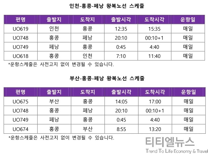 홍콩-페낭 노선은 매일 1회 운항할 예정이다. 스케줄은 홍콩 20:10 출발, 페낭 00:10 도착 그리고 페낭 00:45 출발, 홍콩 04:40 도착이다. 한국 출발편의 경우 인천-홍콩-페낭 및 부산-홍콩-페낭 왕복노선 모두 당일연결이 가능하다. 인천 및 부산에서 홍콩까지 비행 소요시간은 약 3시간 30분, 홍콩에서 페낭까지 비행 소요시간은 3시간이다.