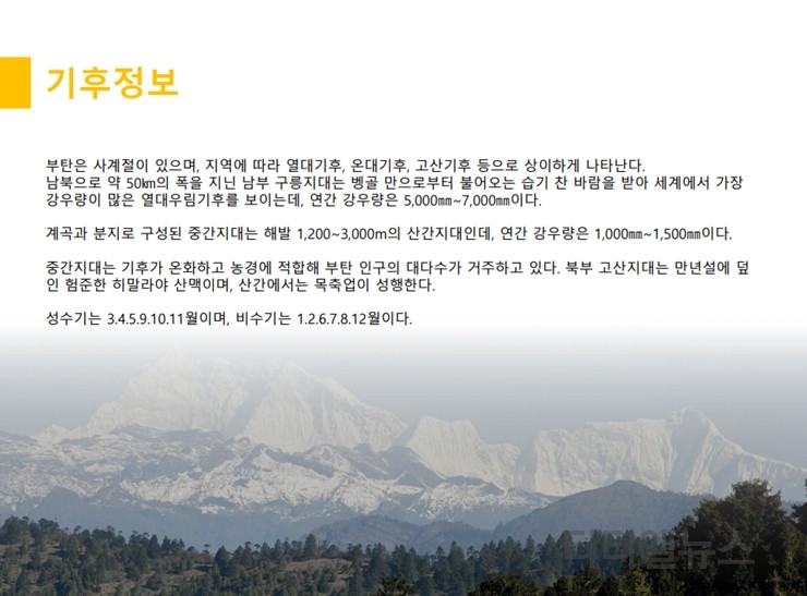 부탄은 사계절이 있으며, 지역에 따라 열대, 온대, 고산기후 등 여러 가지로 나뉘어 있다. 하지만 부탄은 춥지도 덥지도 않다. 우리가 해변으로 휴가를 많이 가는데 이제 내년부터는 부탄으로 휴가 간다. 그런 이야기가 나올 수 있을 것 같다. 부탄의 여름 온도는 25~26도 사이를 이루고 있기 때문에 우리 한국과 동남아 같은 찜통 더위를 피해갈 수 있는 또 하나의 지역이 되지 않을까 싶다.