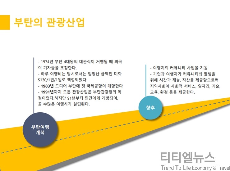 부탄의 관광산업은 1974년 부탄의 4대 왕 대관식에 외국 기자들을 초청하면서 시작됐다. 하루 여행비가 그때만 해도 1인당 130달러로 책정됐었다. 1983년 첫 공항이 개항됐고, 1991년 관광청이 설립됐다. 그 전까지는 관광청이 없었다. 부탄여행을 보면, 부탄의 커뮤니티를 먼저 봐야 한다는 그런 말씀을 드리고 싶다. 부탄 지역사회에 대한 사회적 서비스와 일자리, 기술, 교육, 환경 이런 부분들을 우리가 부탄에서 보고 경험을 해야 한다.