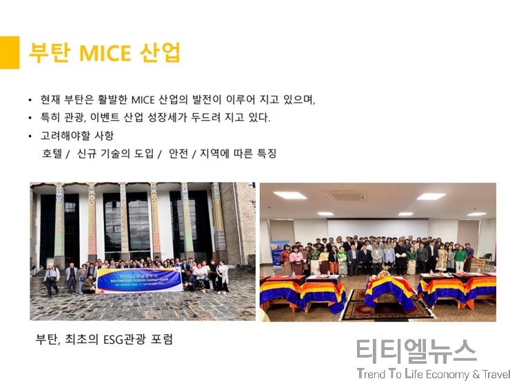 부탄의 마이스 산업을 보면, 부탄은 전에 마이스가 무엇인지 몰랐다. 그러다가 올해 우리도 마이스를 해야겠다. 그래서 마이스를 부탄에서 계획하고 진행하는 과정에서 관광세를 일시적으로 면제하도록 관광청에 정책 제안을 하게 됐다. 이 부분은 지난 8월에 부탄에서 최초로 ESG 관광 포럼을 진행했던 사진이다.
