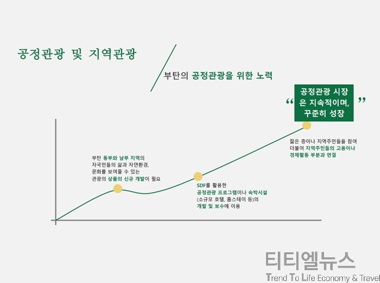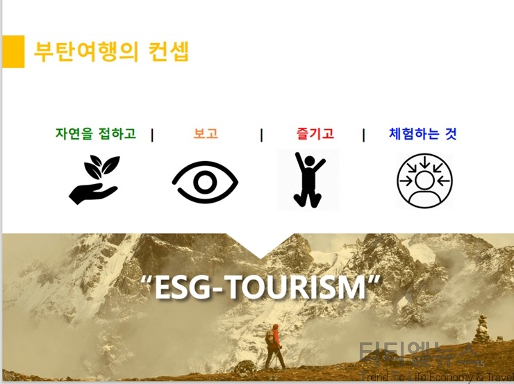 최근 지속가능한 ESG가 다양한 분야로 확장되면서 관광에서도 급속도로 활성화 되는 추세다. 관광이 웰빙과 건강 등 삶의 질을 상승시키는 데 중요한 역할을 하고 있다는 점과 환경적인 가치의 중요성에 대한 인식이 확대되면서 도보여행, 생태관광, 힐링 투어 등 자연 친화적 관광 활동에 대한 수요가 급속도로 증가하고 있다. 지속가능한 ESG 관광에 대한 형태와 ESG 경영 패러다임 부상 등 최근 떠오르고 있는 세계적인 이슈를 부탄에서는 이미 오래전부터 정책으로 개발해 실행해 오고 있다는 점을 부각하면서 부탄의 ESG 관광에 대한 실행과 정책 등을 한국 국민들에게 적극적으로 알려 선진화된 부탄의 ESG 관광에 대한 이해도를 높여 많은 한국인 관광객들이 부탄을 방문해 줄 것을 기대하고 있다.