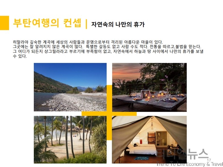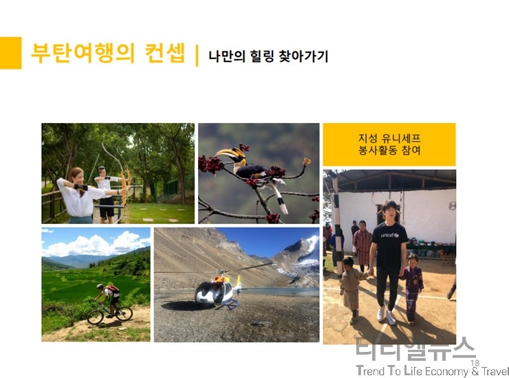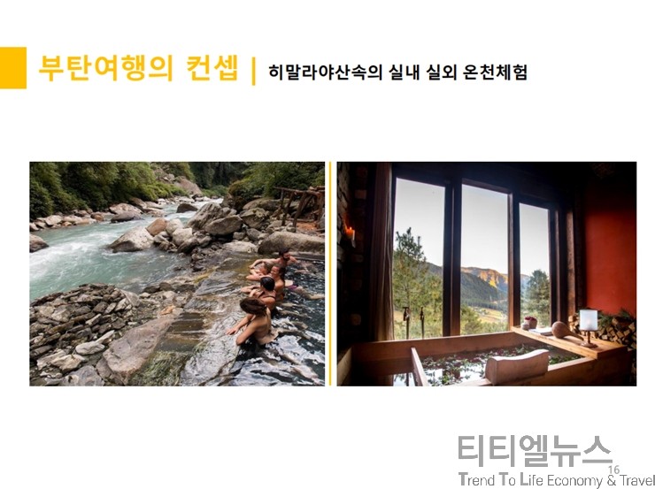 부탄 여행 컨셉에 대해 말씀드린다. 첫째 부탄은 70% 이상이 나무다. 한국은 산이 많아도 산에 가면 에너지를 느낄 수가 없다. 왜 그럴까. 많이 훼손됐다. 부탄은 집 근처만 나가도 조류나 산 짐승들을 직접 볼 수 있다. 그런 환경들이 만들어져 있다. 그것을 직접 접하고 보고 또한 즐기고 체험할 수 있는 그런 국가이기 때문에 ESG 관광을 할 수 있는 국가라고 말씀드릴 수 있다. 온천에 대해 알아보면, 부탄 물은 성스러운 물이라고 해서 아픈 분들이 온천을 하고 나면 건강도 회복된다. 유럽에서 오신 분들이 많이 찾고 있는 그런 온천이다. 패키지 만이 아니고 유럽, 미국인들은 한두 명 또는 가족 단위로 부탄에 와서 자신만의 시간을 보내고 또 거기에서 자기의 미래를 찾는 분들도 있고, 자기의 생각을 정리하시고 건강을 찾아서 돌아가는 분들이 많아 부탄은 자연 치유란 특별한 관광 효과도 경험하게 된다.