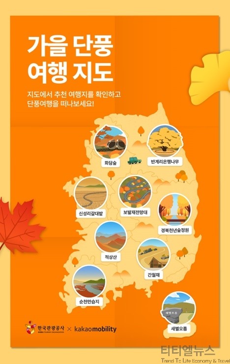 [티티엘뉴스] 한국관광공사(사장직무대행 서영충, 이하 공사)와 카카오모빌리티가 30일, 가을을 맞이해 전국 단풍 명소 27곳을 소개하는 ‘가을 단풍 여행 지도’를 선보인다고 밝혔다.