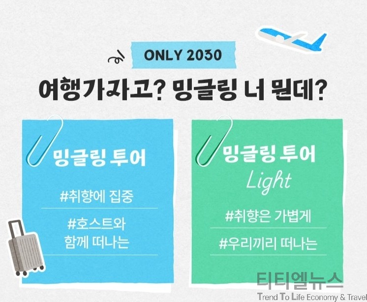 밍글링 투어와 마찬가지로 오픈 채팅과 밍글링 타임을 통해 소통하지만 특별한 호스트와 취미 테마 없이 2030 여행자 간 밍글링 요소를 강화한 점이 차별화 포인트다. 호스트 대신 여행 인솔자가 밍글링 프로그램과 안전 전반을 담당한다.