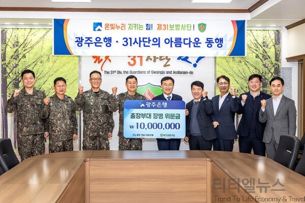 [티티엘뉴스] 광주은행(은행장 고병일)은 지난 22일, 다가오는 설 명절을 맞아 지역 향토부대인 제31보병사단(사단장 이일용)을 방문해 1천만원의 위문금을 전달했다고 23일, 밝혔다.