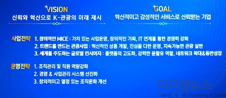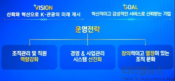 김 대표는 그러기 위해서 운영자의 조직 관리도 필요하지만, 역량 강화가 필수적이라면서, 직원들의 역량 강화를 꾸준히 해가겠다고 점을 확실히 했다. 해외 박람회, 설명회에 적극적으로 참여해서 세계적인 관광업계의 선도적인 업체와 나란히 어깨를 하고, 그 사람들과 경쟁할 수 있는 역량을 만들어야 한다고 강조하면서, 이제는 경영 사업 관리를 시스템화해야 한다고 밝혔다. 그래야지 투명성을 인정받을 수 있고 경비 절감이 되며, 직원들이 돈을 많이 받아갈 수 있는 기회를 만들 수 있다고 강조했다. 김 대표는 돈은 함께 벌어서 함께 가져가는 것이라며, 그것이 지속 가능한 앞으로의 성장 가능성이라고 말했다. 김 대표는 자신이 창의, 열정을 계속 이야기했다며, 바로 우리가 지금부터 시작해야 한다고 강조하면서, 우리는 창의와 열정을 가지고 우리가 운영 전략을 꾸려간다면 절대 세계적으로 뒤지지 않을 거라 생각한다는 점을 분명히 했다.