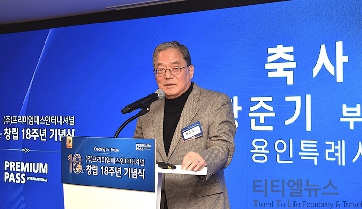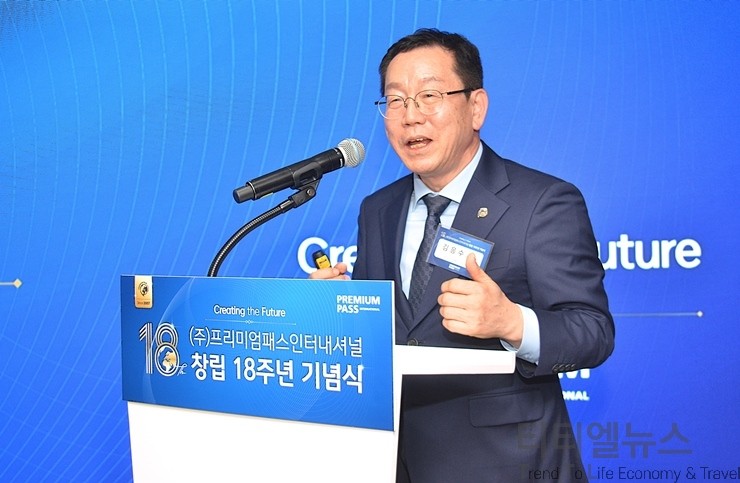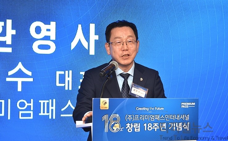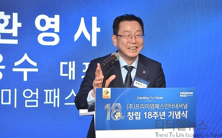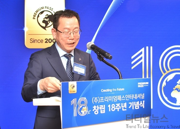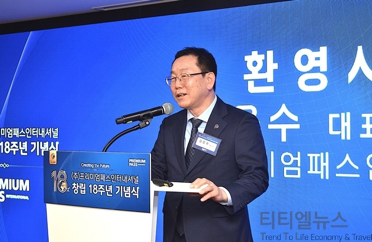 그러나 18년이 지난 지금 모든 사람들이 프리미엄패스를 부러워하고 있다. 그때 그 선택이 옳았다. 그때 그러한 서비스를 아무도 한국에서 하지 않았는데 과연 그 비즈니스 모델이 지금 18년이 지난 지금 시점에 올바른 판단이었다. 다들 이렇게 얘기한다. 솔직히 부러워 죽겠다. 프리미엄패스의 성공은 솔직히 결코 우연이 아니다. 김응수 대표의 뛰어난 리더십과 미래를 보는 예지력 그리고 체구는 작지만 위기가 올 때마다 진짜 정면 돌파다. 뒤를 돌아보지 않고 오로지 앞으로만 나아가는 그 추진력 때문에 이렇게 오늘날의 프리미엄패스가 있지 않았나 생각한다. 또 김응수 대표뿐만 아니라 오늘 이 자리에 계신 프리미엄패스의 임직원 여러분들이 있었기 때문이다. 리더가 아무리 뛰어나도 혼자 잘 뛰면 그 게임 안 된다. 축구 경기랑 똑같다. 감독도 필요하고 선수도 필요한데 우리 김응수 대표가 감독이었다. 그러면 우리 프리미엄패스 직원들은 뛰어난 플레이어였다고 생각 한다. 같이 힘을 합친 그런 결과로 인해서 이런 멋진 18주년 창립 기념 행사가 진행되지 않을까 이렇게 보고 있다. 지난 18년이라는 기간 동안 프리미엄패스가 쌓아온 신뢰와 노하우는 제가 감히 앞으로 30년, 50년 지나도 대한민국 마이스업계에 영원히 길이 남으리라고 생각한다. 이제 여행업의 여행 산업은 새로운 전환점을 맞이하고 있다. 디지털 기술의 발전과 변화하는 고객의 욕구는 우리 모두에게 새로운 도전을 요구하고 있다. 저는 감히 이렇게 말씀드리고 싶다. 그 변화의 선봉장에 우리 프리미엄 패스가 있다. 프리미엄패스는 대한민국의 여행업계와 마이스업계를 업고 간 새로운 기업이며, 새로운 지도자라고 말씀드리고 싶다고 말하며 축사를 마쳤다.