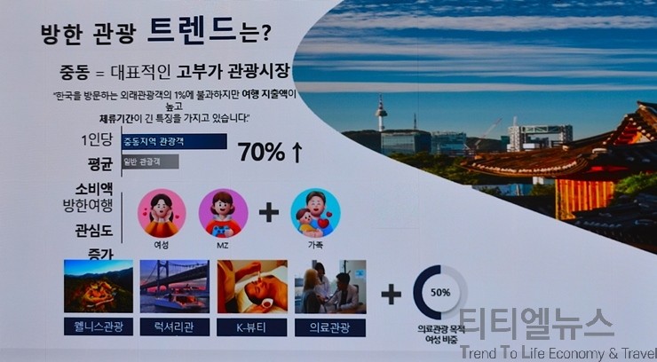두 번째 왠지 옛날부터 유유하게 낙타를 타고 다니는 그런 선조들의 모습에 그런 피를 이어받았는지, 이 사람들은 일명 가성비 투어라고 한다. 짧은 시간 안에 이곳저곳 빠르게 돌아다니는 그런 타이트한 여행 일정보다는 마음을 조금 릴렉스하게 두고 유유히 한가롭게 즐기는 장기간 여행을 선호한다고 한다. 그리고 중동 하면, 딱 오일머니가 떠오른다. 이 국가 자체가 잘 살다 보니까 각종 혜택들로 국민들의 지갑은 넉넉하다. 그러니 해외 여행 한 번 하면 먹고 즐기고 맛있는데 돈을 아낄 필요가 없다. 그리고 아주 고맙게도 이 K-한류, K-콘텐츠가 이 중동 시장 방한 관광 시장에 대해서 이 불을 활활 지펴주고 있다. 떠오르는 K-POP, K-드라마를 보고 아이들 그리고 MG 여성들은 집에 가서 이렇게 말한다. “아빠, 엄마 나 이제 한국 가고 싶어, 한국으로 여행 가고 싶어” 그러면, 가족을 너무나 사랑하는 아빠 엄마는 이렇게 대답한다. “그래 거기가 어딘지는 모르지만 그래 그럼 한번 가보자” 그렇게 긴 비행시간을 견디며 하나둘씩 한국으로 모여든다.