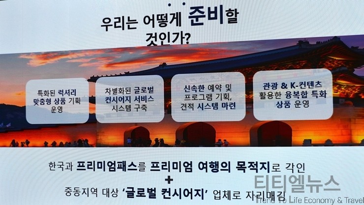 여러분 우리 진짜 열심히 해서 관광 시장, 중동 시장, 중동의 방한 시장에 대해서 한국 관광하면 프리미엄패스라고 각인시켜주고 글로벌 컨시어지 서비스 업체로 자리매김하는 거 어떨까? 저는 벌써부터 심장이 뛰고 있다. 우리 프리미엄패스가 중동 시장 K-관광 미래의 기준을 제시하겠다라고 자신있게 강조하면서 중동시장을 꿰뚫겠다는 강한 집념을 보여 줬다.