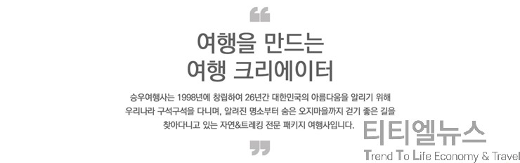 승우여행사는 ‘2025년 꼭 걸어야 할 버킷리스트 여행지 10선’의 전 상품을 기획 판매 중이다. 여행지는 순차적으로 오픈될 예정이며, 자세한 내용은 승우여행사 홈페이지에서 확인 할 수 있다.