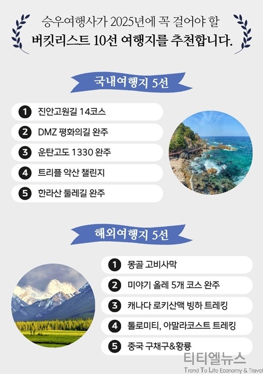 한편, 승우여행사 관계자는 “새해를 맞아 새로운 도전과 목표를 계획중이신 분들을 위해 ‘2025년 꼭 걸어야 할 버킷리스트 여행지를 선정하게 됐다”며, “여행을 통해 목표를 달성하며, 재미있고 의미있는 한 해를 보내길 희망한다”고 전했다.