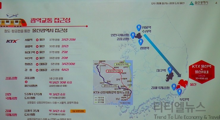 울산은 우수한 관광 자원을 보유하고 있지만, 울산역에서는 가까운 관광지가 약 20분, 멀게는 1시간가량이 소요된다. 지역이 넓어 관광지 간의 거리가 꽤 먼 지역이 되겠다. 최근 청량리와 강릉 간 고속열차가 개통되어서 관광에 대한 교통편이 많이 좋아지고 있다. 관광지로 가는 대중교통이 역에는 다소 많지 않은 편이라서, 지금 시티 투어와 관광 택시를 운영하고 있다. 올 하반기에는 관광지 직통으로 가는 미니 밴을 제작 중에 있고 2028년에는 수소 트램을 운영할 계획으로 준비 중에 있다. 울산에 있는 관광 호텔에도 장애 숙박 시설이 있지만, 추가로 구축을 원하면, 시에서 장애인 무장애 사업으로 지원을 할 계획이다. 누구든 떠날 자유, 모두가 누릴 수 있는 관광 보편화를 위해서 울산시는 전국 최고의 무장애 열린 관광 도시로 만들어 나가고 있다.
