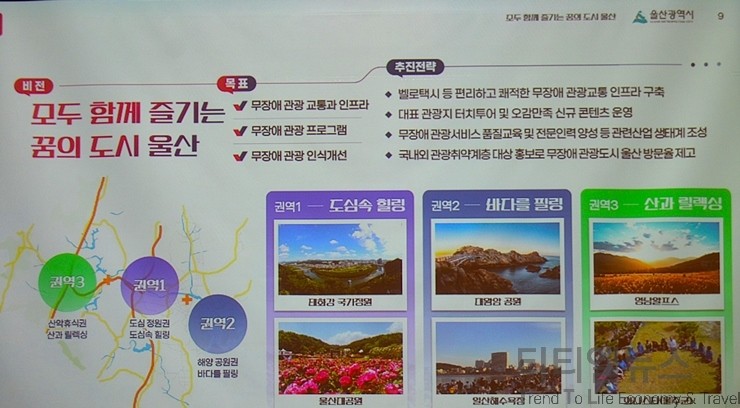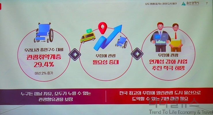 손경옥 관광정책팀의 설명에 따르면, 울산시는 올해 모두 함께 즐기는 꿈의 도시 울산을 위해 사업을 추진할 계획이라고 밝혔다. 바로 무장애관광도시 사업이다. 이 사업은 전년도에 문체부에서 전 지자체를 공모로 선정을 했는데 울산시가 유일하게 선정됐다. 중앙 정부에서도 울산이 관광 도시로 발전할 수 있다는 걸 확인한 것. 무장애관광 사업은 관광 취약 계층인 장애인, 고령자, 임산부, 영유아가 대상이다. 울산은 24% 정도 됐으며, 전국은 28%로 무장애 관광 환경이 필요하게 됐다.