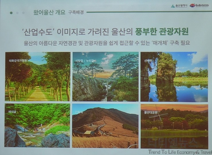 올해 국내외 단체 관광객 유치 인센티브 지원과 특수 목적 관광 유치 지원 사항에 대해 울산광역시 김혜정 관광 마케팅 팀장의 자세한 설명이 이어졌다. 김혜정 팀장이 밝힌 내용을 보면, 야간 관광 상품이 그렇게 많지 않지만, 태화강 십리대숲을 은하수 길이라는 표현으로 해서 반짝반짝 한 그런 길을 만들었다. 야간에 와서 관광하고, 숙박까지 할 수 있는 상품을 만들 수 있는 콘텐츠라고 생각하면 된다. 대왕암 공원도 설명할 때 신라 문무 대왕의 비가 호국용이 됐다는 스토리 텔링을 가지고 있는 곳이다. 강소형 잠재 관광지로 대왕암공원 옆에 슬도가 선정됐다. 대왕암 공원부터 슬도까지 도보로 갈 수 있는 트레킹 길을 예쁘게 만들어 놓고 정비도 잘해 놓았다. 대왕암 공원에서 하차해 슬도까지 걸어갈 수 있는 그런 트레킹 상품을 만들 수 있는 그런 콘텐츠로 사용하면 된다.