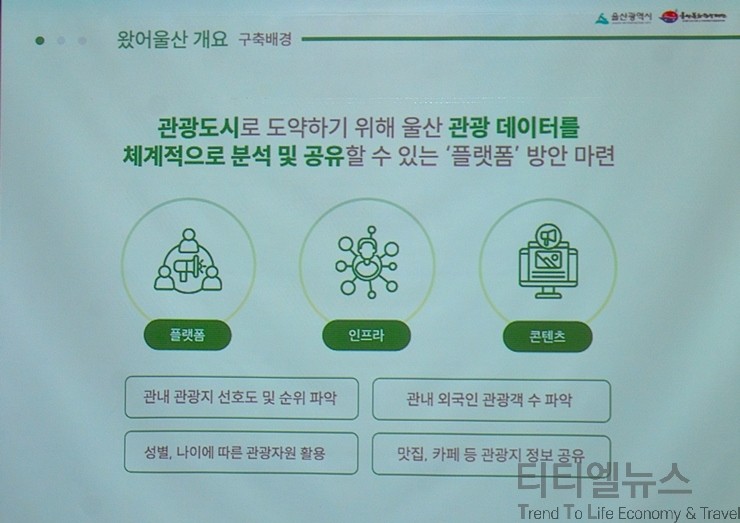 울산 문화관광재단 박경수 스마트관광팀장이 설명한 스마트 관광 앱 ‘왔어울산’에 대한 설명을 보며, 발표는 첫째 왔어울산 개요, 주요 서비스, 왔어 울산 3.0 등이다. 첫 번째 아스 울산 구축 배경에 대해 울산은 대한민국 산업의 중심지이자 산업수도이다. 그러나 산업 도시 이면에는 풍부한 자연경관과 관광 자원을 보유하고 있는 도시이기도 하다. 그래서 울산이 가지고 있는 다양한 해양 관광 자원을 여행객 입장에서 쉽게 접근할 수 있는 매개체가 필요하다는 인식에서 출발했고, 결국 관광의 콘텐츠, 플랫폼, 인프라 등이 통합된 최신의 ICT 기술을 융합한 왔어울산 어플이 탄생하게 됐다.
