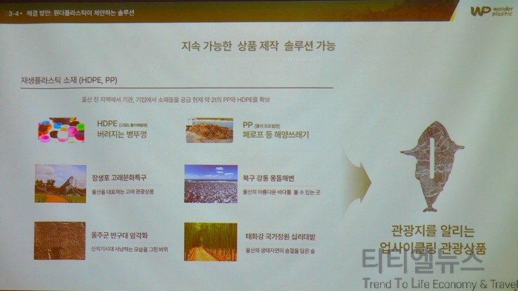 제조 과정을 보면, 폐플라스틱을 수거하고 정밀 세척을 통한다. 그리고 색소를 쓰지 않기 위해서 20가지 이상의 색상을 직접 불려야 한다. 그리고 분쇄를 통해서 소재를 직접 만든 다음에 소재로 제품을 생산하는 과정을 거친다. 구체적인 프로세스는 8단계 분점으로 나누어진다. 특히, 울산 공업도시 이미지에서 환경 친화 도시 이미지로 바꾸는 과정에서 아주 적합하다고 보고 있다. 뿐만 아니라 서울이나 부산, 제주도에서도 업사이클 관광 상품에 대한 성공 사례가 굉장히 많아지고 있다. 울산에서의 성공사례를 원더플라스틱이 같이 쓰겠다. 원더플라스틱의 제품은 울산을 대표하는 고래를 형상화한 고래 키링부터 나뭇잎을 형성화한 나뭇잎 튜브 짜개와 업사이클 비즈 팔찌, 공룡 관절장난감 그리고 이어서 강아지 형상의 키링이 개발되고 있다. 단순히 키링에 그치지 않고, 청소년들이 이용하는 과학 키트에도 개발하고 있으며, 더 나아가서 확장성으로 인테리어나 파일 그리고 생활용품, 가구에도 제작할 수 있는 기술을 갖추고 있다.