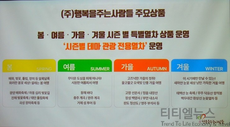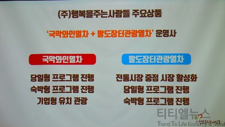 관광 트렌드로 부상하고 있는 기차 여행 전문 여행사로서의 큰 인기를 끌고 있는 행복을 주는 사람들에 대한 설명은 원종혁 이사가 나섰다. 원 이사의 설명에 따르면, 행복을 주는 사람들은 국악 와인 열차와 팔도장터 열차까지 운영하고 있는 회사다. 관광 전용 열차 여행사라고 보면 된다. 2012년에 설립해서 13년 동안 특별한 만남과 색다른 여행을 위한 행복한 동행을 목표로 관광 전용 열차를 운영하고 있다. 국악 와인 열차는 245석으로 전 객차의 사용 테이블로 구성이 돼 있어서 열차 내에서 와인과 간식을 제공하고 또 국악과 레크레이션을 제공하는 이벤트형 관광 전용 열차라고 보면 된다.
