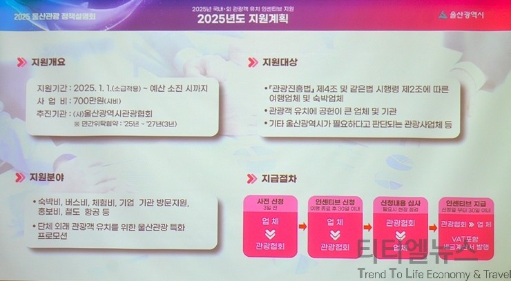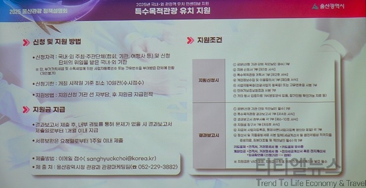 설명회는 2025년도 울산시에서 중점적으로 추진한 관광 정책들과 지역 축제 관광 사업 지원 그리고 올해 단체 관광객 유치 인센티브와 특수목적 관광 유치 지원 사업 소개 등의 순으로 진행됐다.
