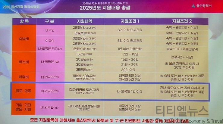 당일 관광으로 오는 분들도 있어서 버스비 지원을 당일 관광으로 진행을 하고 있다. 인원수별로 차등 지원하고 있다. 체험비는 숙박과 버스에 대한 조건을 전부 다 하고, 추가로 했을 때 최대 2만 원 50% 한도 내에서 진행한다. 올해 부산 부전역에서 출발해 강릉과 청량리 가는 ITX-마음(강릉-태화강중간 울산역, 태화강역에서 정차하는 KTX 이음 열차가 개통됐다. 이 이음 열차를 통해서 더 많은 사람들이 오고 갈 수 있는 교통 중심이 생겼다. 이 상품을 구성할 수 있게 하려고 철도와 항공 쪽 관련된 인센티브를 구성하고 있다.
