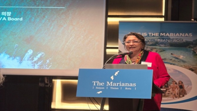 2월26일 서울 JW메리어트동대문스퀘어에서 개최한 기자간담회에서 글로리아 카바나(Gloria Cavanagh) 마리아나관광청 이사회 의장이 마리아나 제도를 소개하고 있다. 올해 마리아나관광청의 캠페인 슬로건은 'This Is The Marianas'(여기가 바로 마리아나!)이다.