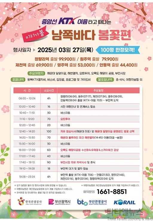 [티티엘뉴스] 한국관광공사(사장직무대행 서영충, 이하 공사)는 한국철도공사(코레일), 부산광역시, 부산관광공사와 함께 지난 7일, ‘미리가봄–남쪽바다봄꽃편’ 당일 여행상품을 출시했다.