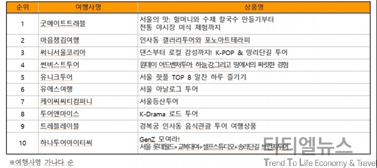 2025 서울시 우수관광상품 운영사로는 △굿메이트트래블, △마음챙김여행, △써니서울코리아, △썬버스트투어, △유니크투어, △유에스여행, △케이씨씨티컴퍼니, △투어앤마이스, △트레블레이블, △하나투어아이티씨 총 10개 사가 선정됐다.