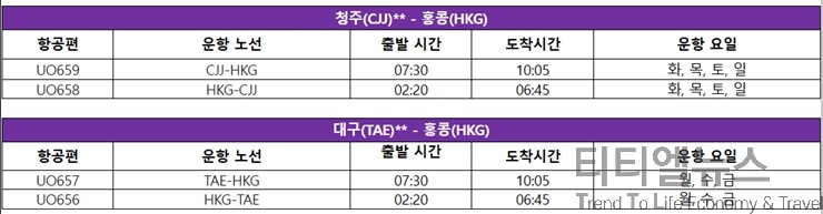 [티티엘뉴스] 홍콩익스프레스(HK Express)가 홍콩으로 가는 신규 노선을 운항하며 여행객들에게 더 많은 선택지를 제공한다. 2025년 6월 5일과 6월 6일부터 각각 청주국제공항(CJJ)과 대구국제공항(TAE)에서 홍콩으로 향하는 직항편을 운항한다고 14일 밝혔다.