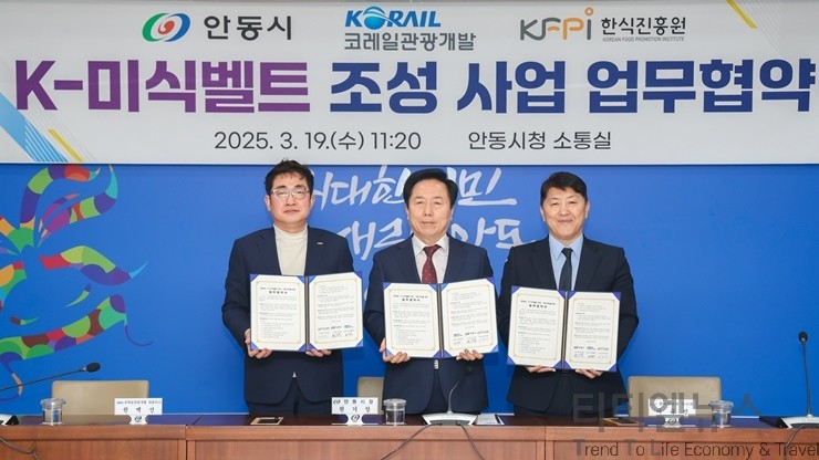 [티티엘뉴스] 코레일관광개발(대표이사 권백신)은 19일, 안동시(시장 권기창), 한식진흥원(이사장 이규민)과 K-미식벨트 조성사업의 원활한 추진을 위해 업무협약을 체결했다고 밝혔다.