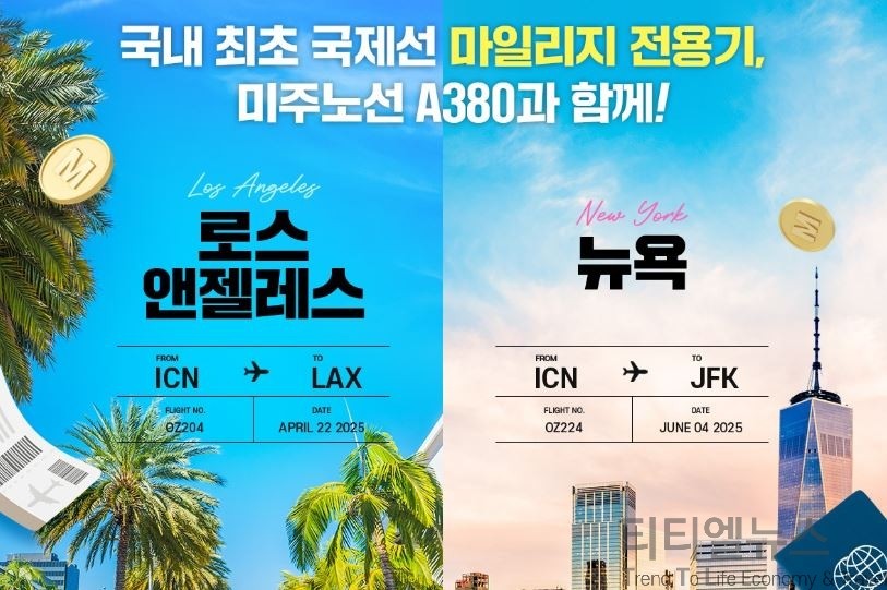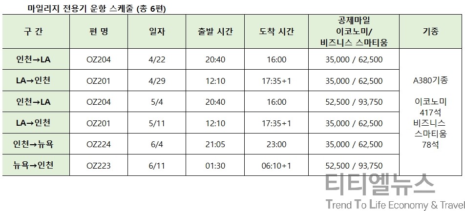 [티티엘뉴스] 아시아나항공(OZ)이 4월부터 미주노선에 마일리지 전용기를 운영한다고 밝혔다.