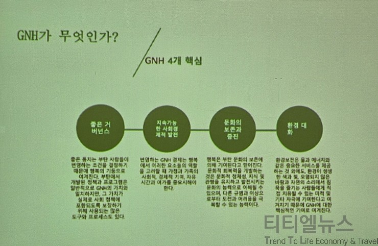 부탄은 경제적인 개발보다는 행복을 추구하기 위한 GNH 정책을 가지고 있다. ESG는 한국에서 10년이 채 안 된 역사를 가지고 있지만, 부탄은 정확히 53년동안 GNH정책을 실시하고 있다. 부탄은 공동체 사회이기 때문에 지역민들과 소통하면서 공정관광을 해야 하며, DSP와 함께해야 한다고 발표했다