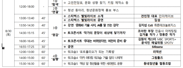 아울러 △최신 유행 소식지를 발행하는 캐릿의 강지혜 편집자가 ‘요즘 청년 취향의 방향’을 주제로, △인공지능 신생기업 뤼튼테크놀로지스의 김지섭 실장(Chief of Staff, CoS)이 ‘인공지능을 잘 쓰는 감각’을 주제로 강연한다. △자작 가수 김마리와 △힙합 듀오 이짜나언짜나, △국악기반 전자밴드 ‘64크사나(ksana)’, △스타벅스코리아의 청년 문화예술 인재 후원 사업인 ‘별빛라이브’를 운영하는 인더케이브의 견민정 대표와 밴드 집섬은 공연 무대에 올라 청년들의 감성을 키운다.