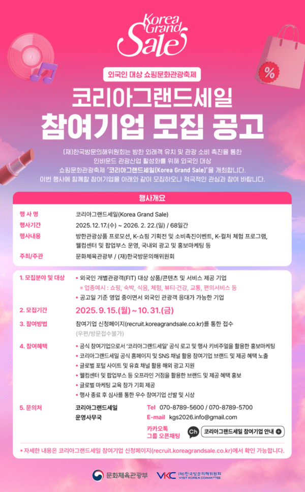(재)한국방문의해위원회(위원장 이부진)는 외국인 대상 쇼핑문화관광 축제‘코리아그랜드세일’참여기업을 9월 15일부터 10월 31일까지 모집한다고 15일 밝혔다.