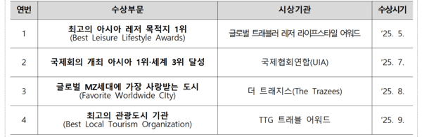 서울은 이번 TTG 어워드 수상뿐만 아니라, 올해 5월 미국 글로벌 트래블러 레저 라이프스타일 어워드(Global Traveler Leisure Lifestyle Awards), 8월 더 트래지스(The Trazees) 등 주요 국제 관광·MICE 어워드를 잇달아 수상하며 글로벌 무대에서의 위상을 높이고 있다. 이는 서울이 세계가 선택하는 관광·MICE 목적지로서의 도시 브랜드를 확고히 하고 있음을 보여준다.
