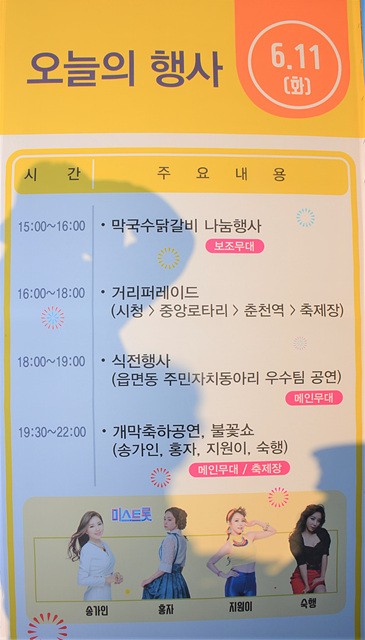 개막 6일째인 16일 축제 마지막 날에는 메인무대 공연으로 오후 5시 태권도 시범 공연, 오후 6시 호반위드 오케스트라 공연, 오후 7시 30분 한국전통타악그룹 태극 폐막식과 불꽃쇼가 진행된다. 보조무대에서는 12시 원미경의 통기타, 오후 1시 레크타임, 오후 2시 가수 배아현·레크타임 봄봄, 오후 3시 상품증정 진로, 오후 3시 30분 막국수&닭갈비 나눔행사, 오후 4시 장미 레크타임 등이 진행된다.