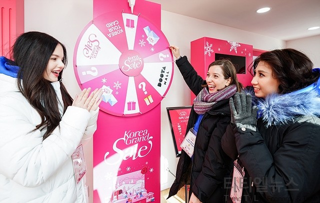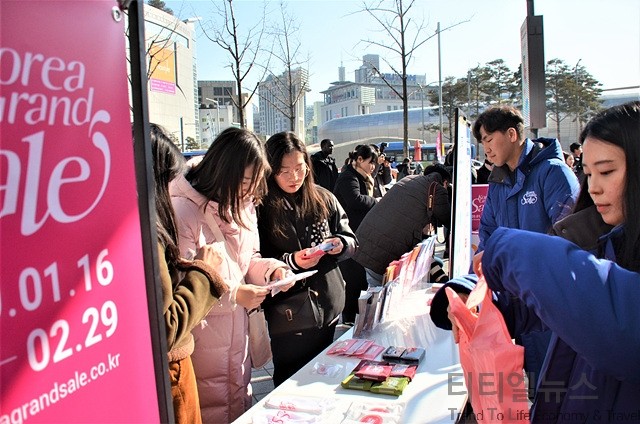 ▲2020 코리아그랜드세일 개막식 직후 동대문 두타몰에 설치된 웰컴센터를 방문한 외국인 관광객들이 이벤트를 즐기고 있다 ▲2020 코리아그랜드세일 개막식 직후 동대문 두타몰에 설치된 여행자 서비스 센터 앞에서 각종 홍보물과 선물을 받으며 즐거워하고 있다 항공·교통, 숙박, 쇼핑, 뷰티·건강, 체험 등 다양한 분야의 혜택을 비롯하여 K팝, K뷰티, K푸드, K헤리티지, K윈터 등 다채로운 K-Culture 체험 콘텐츠를 통해 한국에서만 경험할 수 있는 문화 체험 프로모션과 우수한 상품으로 한국 관광의 즐거움을 체험할 수 있게 된다.