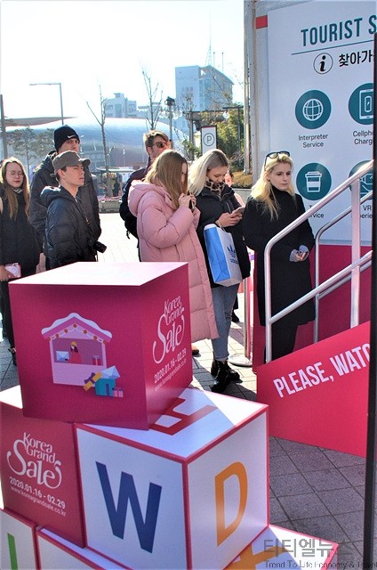▲2020 코리아그랜드세일 개막식 직후 동대문 두타몰에 설치된 웰컴센터를 방문한 외국인 관광객들이 코리아그랜드세일 티켓을 들고 즐거워 하고 있다 ▲2020 코리아그랜드세일 개막식 직후 외국인 관광객들이 동대문 두타몰에 설치된 여행자 서비스 센터를 둘러보기 위해 기다리고 있다 특히 이번 2020 코리아그랜드세일에서는 항공 최대 95% 할인, 숙박 최대 80% 할인, 쇼핑 최대 50% 할인 등의 특별한 할인 혜택이 기다리고 있다. 또한, 주요 공항 및 서울시내 관광지에서 외국어 통역, 행사 안내, 경품 이벤트 등 대한민국 여행이 더욱 즐거워지는 웰컴 센터도 함께 운영된다.