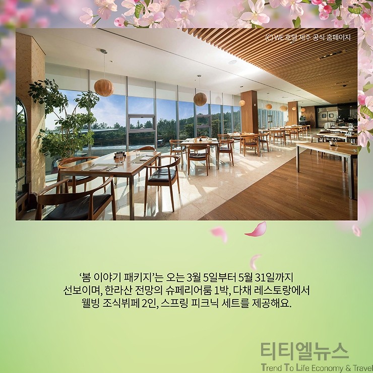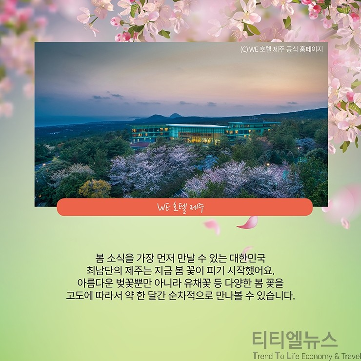 [티티엘뉴스] 봄 소식을 가장 먼저 만날 수 있는 대한민국 최남단의 제주는 지금 봄꽃이 피기 시작했다. WE 호텔 제주는 입구에 들어서는 순간부터 봄의 향기로 가득하다. 특히 제주도는 국내에서 제일 높은 한라산이라는 특성 때문에 아름다운 벚꽃뿐만 아니라 유채꽃 등 다양한 봄 꽃을 고도에 따라서 약 한 달간 순차적으로 만나볼 수 있다.