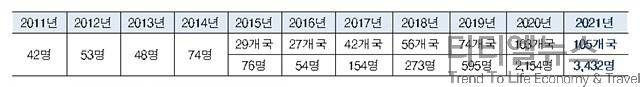 [티티엘뉴스] 문화체육관광부(장관 황희, 이하 문체부) 해외문화홍보원(원장 박정렬, 이하 해문홍)은 2021년 ‘제11기 코리아넷 명예기자단’으로 105개국 3,432명을 선발했다. 이는 지난해보다 국가는 2개국, 인원은 1,278명 늘어난 수치로 역대 최대 규모이다.